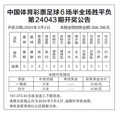 中国体育彩票足球6场半全场胜平负 第24043期开奖公告
