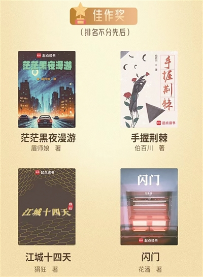 阅文集团旗下起点中文网现实频道举办的2023年秋季征文大赛对外公布评选结果,社会悬疑题材作品《狐之光》斩获首奖,《茫茫黑夜漫游》《手握荆棘》《江城十四天》和《闪门》4部作品获得佳作奖。本次秋季征文结果公布后,起点现实频道随即启动以“重塑美好生活”为主题的2024年春季征文大赛,持续鼓励现实题材网络文学创作。(记者 潘卓盈)