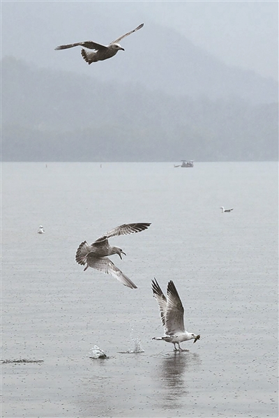 雨中西湖,银鸥争食。 橙友“里尔”摄