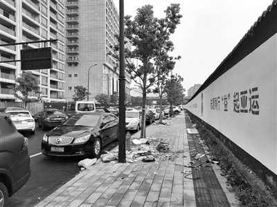 由于西头没有设置围挡,这段250米长的断头路,成了附近商家与居民的停车场,连人行道上都横七竖八地停满了机动车,只留下两条窄小的进出通道。不少车辆蒙着厚厚的灰,车胎也没气了。这给永富大厦沿街商铺的送货车进出带来了不少难题。记者遇到了一位给餐饮店送货的面包车司机,他好不容易找到一处空隙,小心翼翼将车倒了进去,才开始卸货。“我从去年下半年开始往这里送货,一直是这样子。”司机无奈地说,“反正也没人管。还有过路车走错路开进来,没法掉头,只能原路倒出去。”