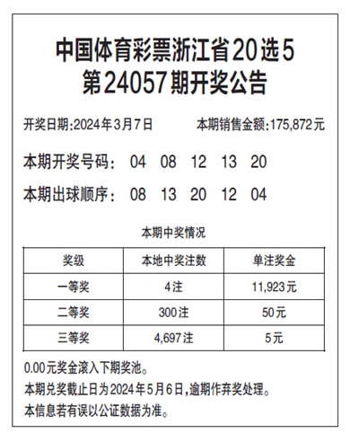 中国体育彩票浙江省20选5 第24057期开奖公告