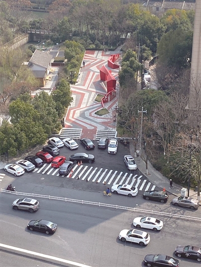 昨天上午10点,橙柿直通车记者来到这个路口,空地上停着9辆车,斑马线也有被车辆占用的情况,行人需要从非机车道通过。空地的台阶往上就是余杭塘河健身绿道入口,有一群老人在打太极,两三个年轻人坐在椅子上小憩,还有人一边遛狗一边聊家常。