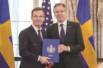 美国国务卿布林肯与瑞典首相克里斯特松3月7日在美国国务院主持仪式,将瑞典加入北约的法律文件正式存放在美国国务院。这标志着瑞典正式成为北约成员国。
