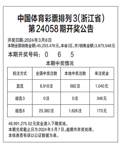 中国体育彩票排列3(浙江省) 第24058期开奖公告