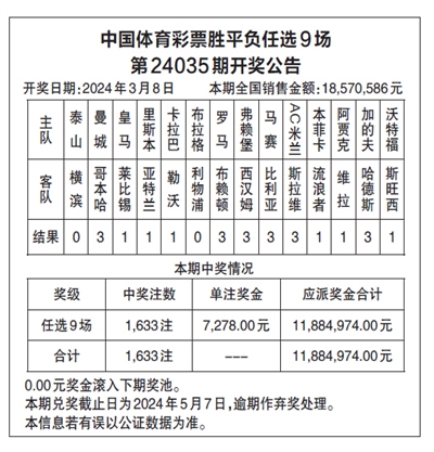 中国体育彩票胜平负任选9场 第24035期开奖公告