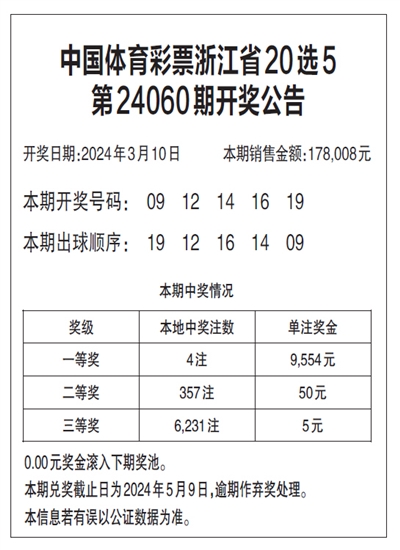中国体育彩票浙江省20选5 第24060期开奖公告