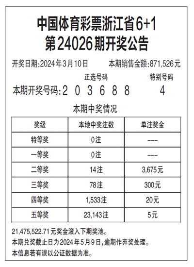 中国体育彩票浙江省6+1 第24026期开奖公告
