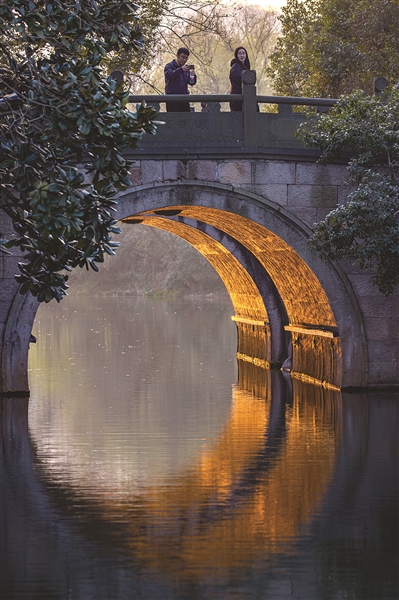 落日余晖照在杨公堤环壁桥的桥洞侧壁上,形成了“金光穿洞”的景象。 记者 陈中秋 摄