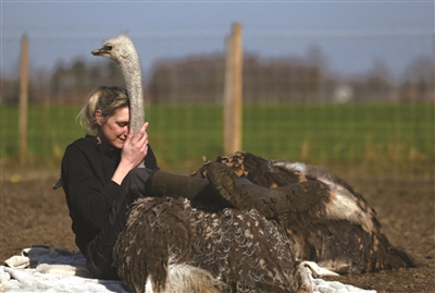 鸵鸟通常被认为是一种具有领地意识和充满攻击性的动物,人们接近它们时要格外小心谨慎。然而,比利时一家动物救助站却为游客提供拥抱鸵鸟服务。