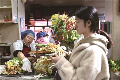 3月16日,在天水名优小吃城,游客挑选好麻辣烫菜品后排队等待加工。