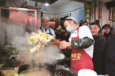 街巷中,天南地北的人们或坐或立地排成长队;小院里,高举的串串“捧花”在摊点前勾勒出“鲜香”的春色。路过的本地人受宠若惊地感叹:“上次天水来这么多人,还是诸葛亮北伐收服姜维的时候!”