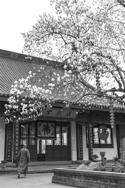 2021年打卡时间为3月1日,那年花开得早,打卡时花已落满了一整个院子。2022年和2023年打卡时间分别是3月12日和3月6日,那时,由于还处于疫情期间,师傅们进出五观堂还戴着口罩。2024年,他去打了两次卡。第一次是在3月10日,当时玉兰花还没怎么开。3月12日又去了一次,花开得很好了,赏花的人有点多。