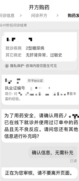 根据线上药师客服回复,点击开方-购买补充信息-填写用药人信息上传处方单或诊断证明,即可提交。记者按照提示操作后,仅勾选“用药人信息”和“2型糖尿病”选项,无需上传诊断便直接跳入问诊开方页面。接着,页面跳出线上医生“为了用药安全,请确认用药人已在线下就诊并使用过订单中的药品且无不良反应”的对话。