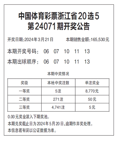 中国体育彩票浙江省20选5 第24071期开奖公告