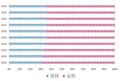 从就诊患者性别来看,女性为主,占66.6%,是男性患者的2倍,且这一比例近十年基本保持稳定。