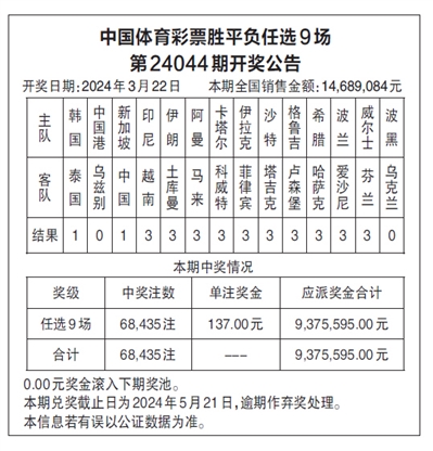 中国体育彩票胜平负任选9场 第24044期开奖公告