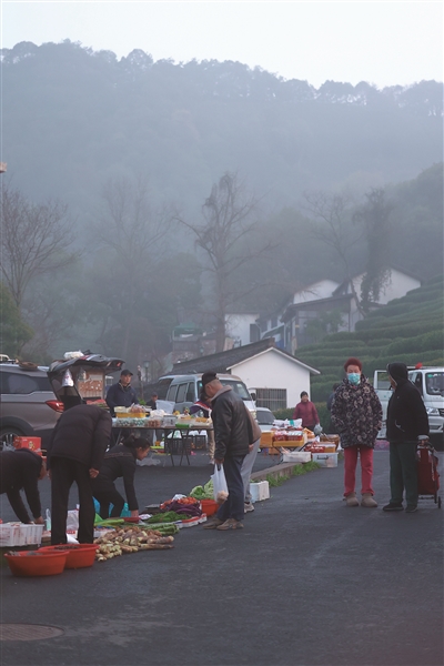 屋子里陆续有人开了灯,陆续有人出了门。他们的活动逐渐唤醒了沉睡的村庄。村民们出门买菜,不用走很远的路,就在茶山边。