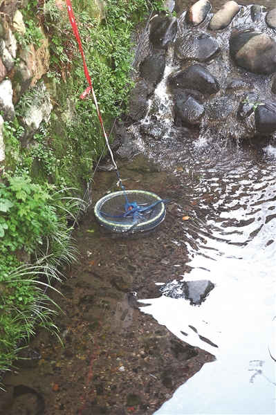 有人会把买来的新鲜的鱼,放在渔网里,沉在溪水中。