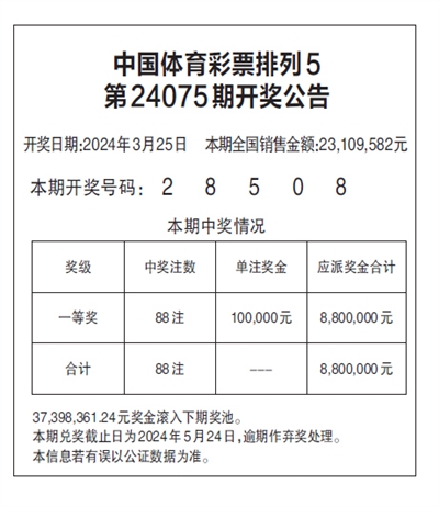 中国体育彩票排列5 第24075期开奖公告
