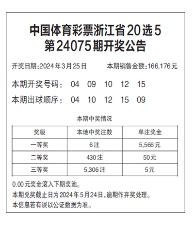中国体育彩票浙江省20选5 第24075期开奖公告