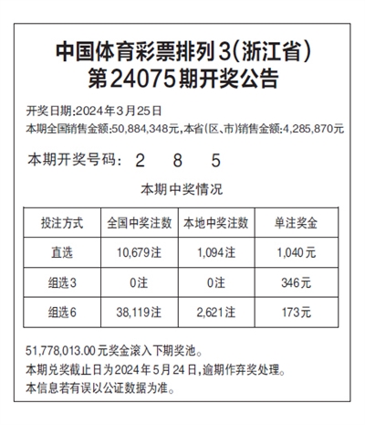 中国体育彩票排列3(浙江省) 第24075期开奖公告