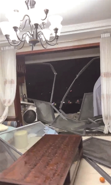 小区另一住户阳台窗户全部变形,玻璃粉碎。