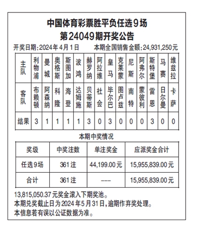 中国体育彩票胜平负任选9场 第24049期开奖公告