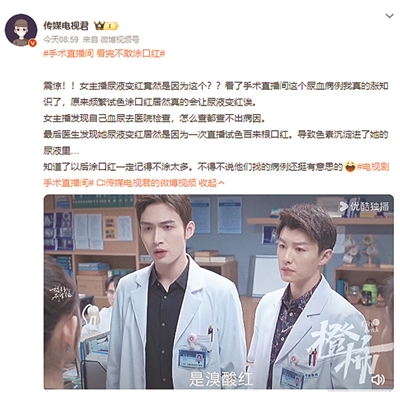 剧中医生称,由于口红应用最多的着色染料是溴酸红,色素沉淀进入了尿液出现了红色,建议女主播回去素颜3天,尿液就会得到改善。