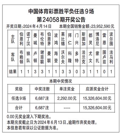 中国体育彩票胜平负任选9场 第24058期开奖公告