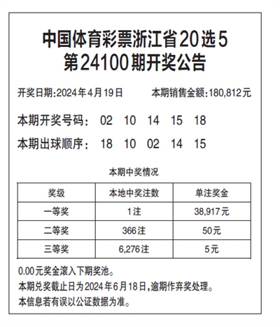 中国体育彩票浙江省20选5 第24100期开奖公告