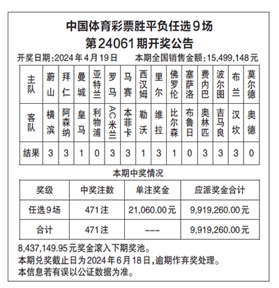 中国体育彩票胜平负任选9场 第24061期开奖公告
