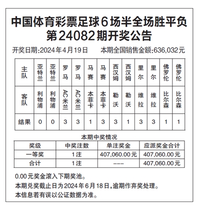 中国体育彩票足球6场半全场胜平负 第24082期开奖公告