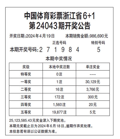 中国体育彩票浙江省6+1 第24043期开奖公告