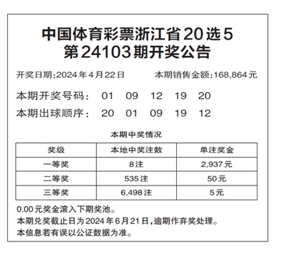 中国体育彩票浙江省20选5 第24103期开奖公告