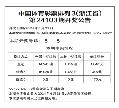 中国体育彩票排列3(浙江省) 第24103期开奖公告