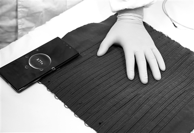 4月22日,复旦大学的研究人员展示手机可放在编织有纤维电池的织物上充电。