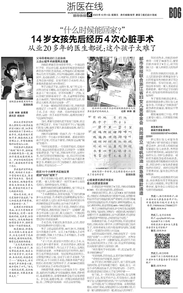 2023年12月1日,都市快报整版刊发《“什么时候能回家?”14岁女孩先后经历4次心脏手术》,同时联合浙江省妇女儿童基金会,共同建立“语帆加油”救急难捐款通道,帮助这个坚强的女孩。来自杭州的一群热心的陌生人,纷纷伸出援手。