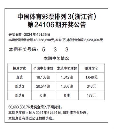 中国体育彩票排列3(浙江省) 第24106期开奖公告