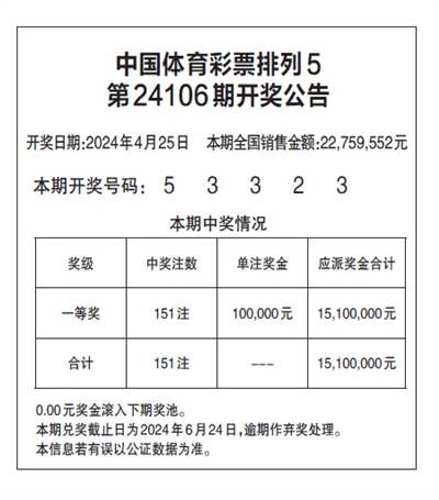 中国体育彩票排列5 第24106期开奖公告