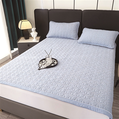 床垫可以折叠,方便收纳,铺在床上,淡蓝色一套很清爽(这个搭配了两个枕套)。