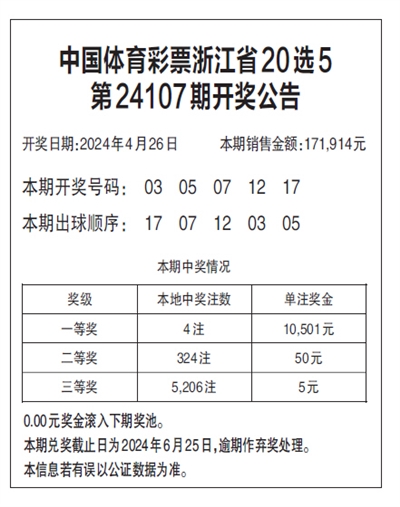 中国体育彩票浙江省20选5 第24107期开奖公告