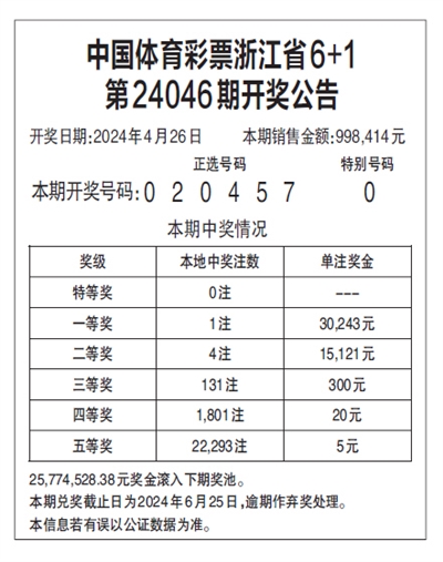 中国体育彩票浙江省6+1 第24046期开奖公告
