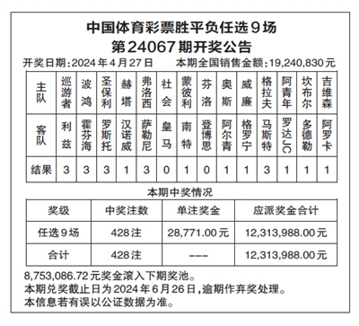 中国体育彩票胜平负任选9场 第24067期开奖公告
