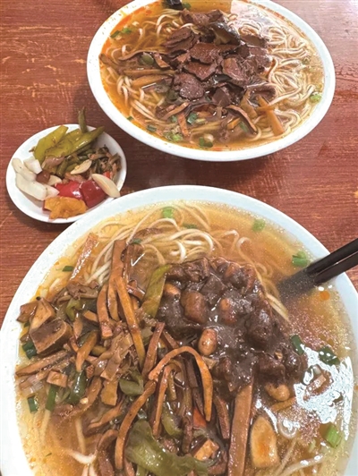 店里的浇头有牛肉、大肠、大排,还有十几种免费小菜:榨菜、萝卜、咸菜、豆角、辣椒……有的酸辣,有的咸爽,每一种小菜都很好吃。