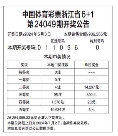 中国体育彩票浙江省6+1 第24049期开奖公告