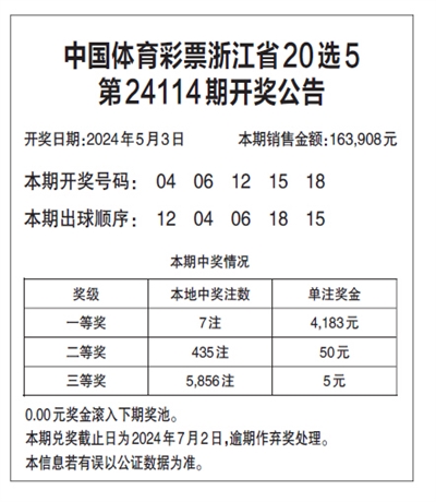 中国体育彩票浙江省20选5 第24114期开奖公告