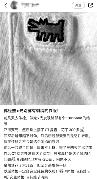 最近,有网友在社交平台上分享了自己体检时虚惊一场的经历——做X光查出肺部有个10mm×15mm的结节,结果却是拍片时所穿衣服上的一个小刺绣。