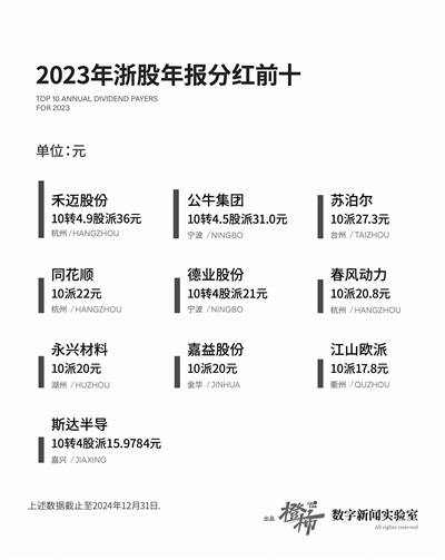 此外,杭州的科技金融公司同花顺以及宁波的德业股份也给出了大方的分红方案,两家公司分别以10派22元(含税)以及10转4股派21元(含税)排名浙江上市公司分红力度排行榜第四和第五位。