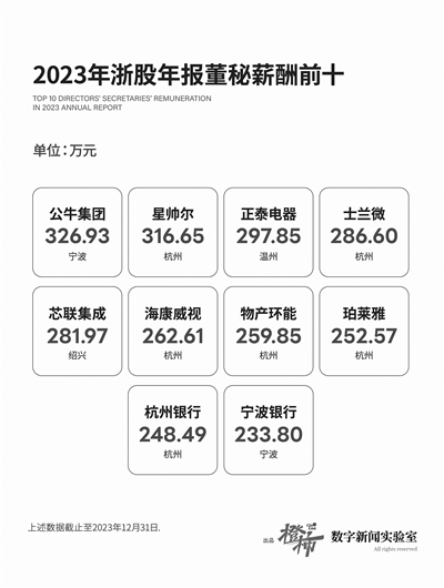 此外,来自士兰微的董秘陈越以及芯联集成的董秘王韦,2023年薪酬分别达到286.6万元以及281.97万元,分列浙江上市公司董秘收入排行榜的第四和第五,一定程度上反映出半导体产业在过去一年的火爆程度。