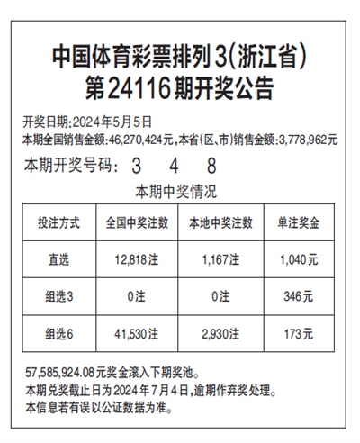 中国体育彩票排列3(浙江省) 第24116期开奖公告